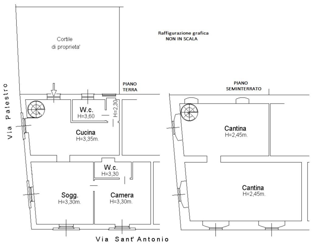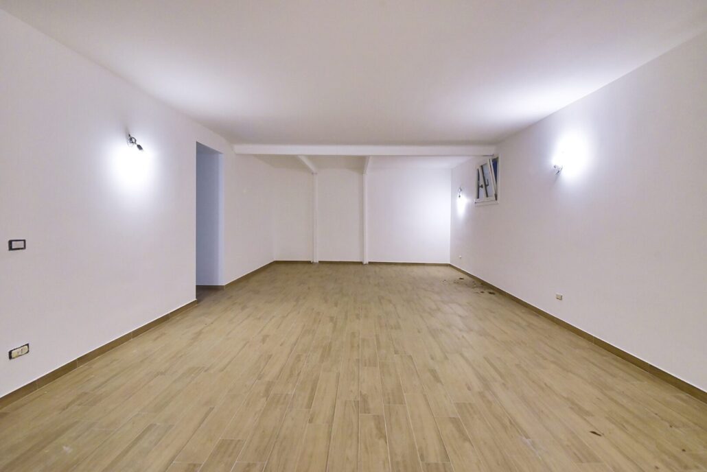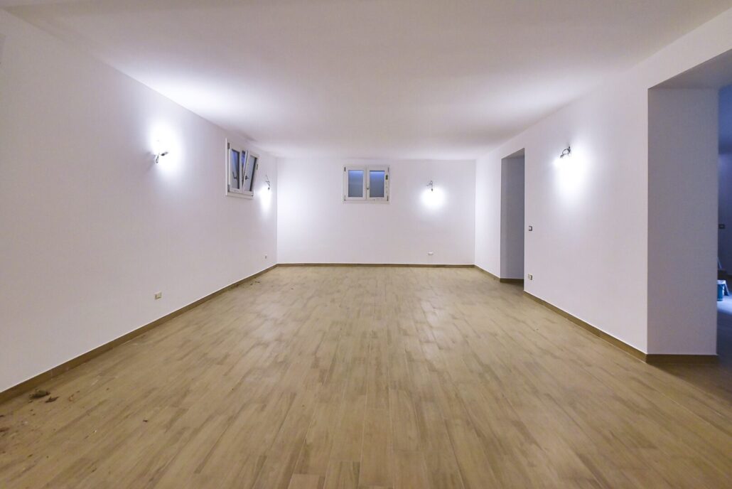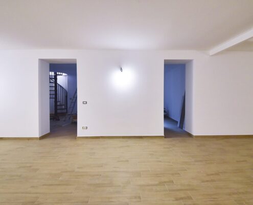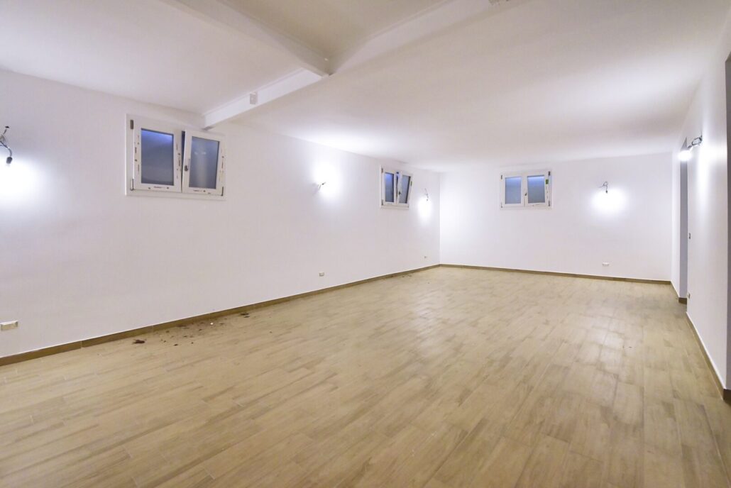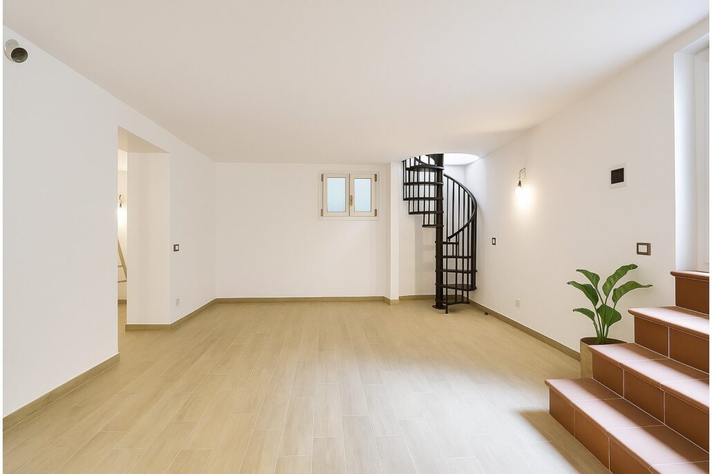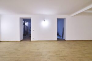 Una scala interna collega al piano seminterrato, di pari metratura, attualmente suddiviso in due locali utilizzati come camere e un ulteriore spazio multiuso ideale come studio, area hobby o zona relax.